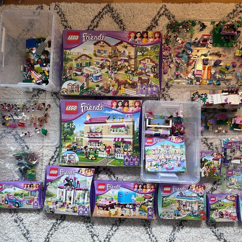 LEGO Friends byggset. Flera olika Friends-set med hus, fordon och tillbehör samt flera figurer och djur. Ingår även lite annat lego såsom disneyprinsessor. Saknas troligen en del bitar därav lågt pris.