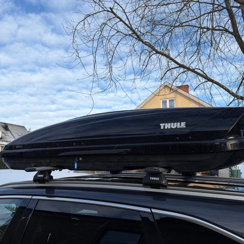 Thule Atlantis 900 svart. Boxen monteras på takräcke för exempelvis resväskor eller sportutrustning. Öppningsbar åt båda håll, mycket användbar egenskap! Invändigt lastbågar/spännen för att hålla packningen på plats. Lås, och nycklar ingår enligt bild. Passar de flesta bilar med kompatibla takräcken, kontrollera mått och infästning mot din bil och dina räcken.