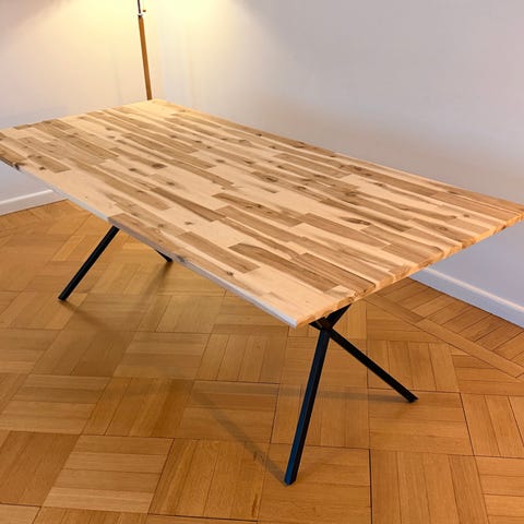 Bordsskivan är av återbrukat trä så varje bord är unikt. Om man inte tycker om patinan, så går det att slipa och olja in igen.