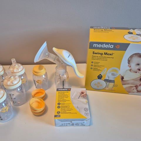 Medela Harmony manuell bröstpump samt Medela Calma flasknapp med tillbehör.