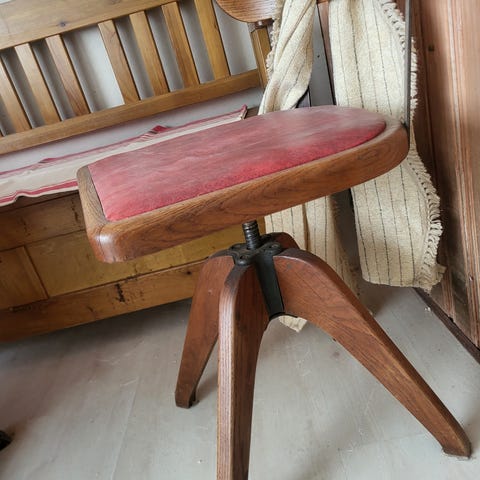 Tramporgel i mörkbrunt trä med dekorativ överdel. Orgeln har manuellt trampverk med två pedaler och ett klaviatur med vita och svarta tangenter. Möbeln har synliga bruksspår och slitage på träytor och paneler. Passar som musikinstrument för den som vill renovera eller som inredningsdetalj i exempelvis vardagsrum, musikrum eller som dekor i äldre miljöer. Det finns en tillhörande pianostol som även är till salu i en annan annons. Hämtas på plats från gården. Ingen bärhjälp