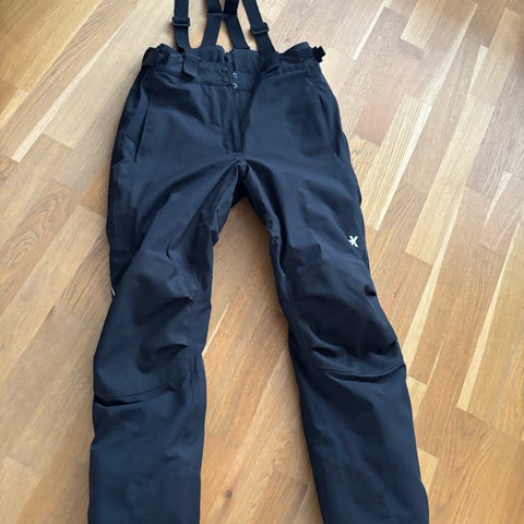 Byxorna har förstärkta partier nedtill vid bensluten och justerbar midja med bälte. Raka ben och reflexdetalj på sidan av ena benet. Tyvärr har axelbanden försvunnit då de aldrig använts Unisex.