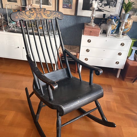 Vacker svart gungstol med guldfärgat mönster. Vintage stil, funkar fint. Bra skick, se bilderna.