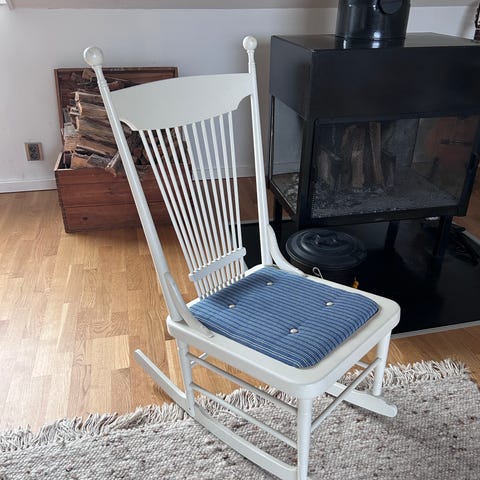 Skulle behöva lite kärlek då den är sliten i färgen. Det finns märken och färgavskav. Stabil och skön att sitta i.