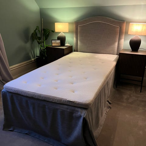 Sängen består av resårbotten, Skotterud (IKEA) samt bäddmadrass, Tustna (IKEA).