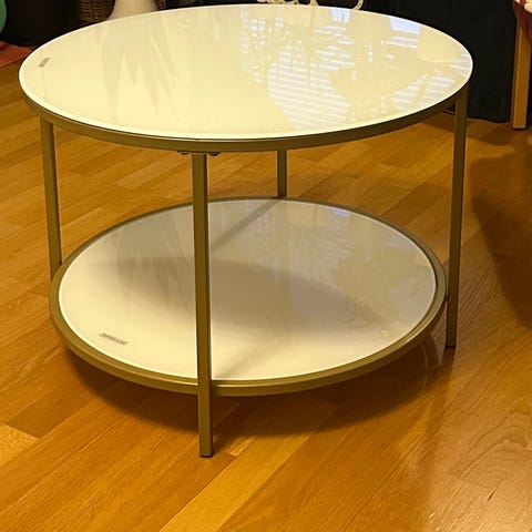 Runt soffbord med två hyllplan. Glasskiva både övre och nedre hyllplan i vit yta, ben och stomme i metall med guldfärgad finish. Bordet har en öppen konstruktion med rund underhylla som ger extra avlastnings- eller förvaringsyta. Passar som soffbord eller sidobord i vardagsrum eller liknande utrymme.