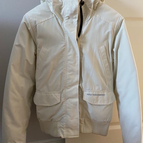 Peak Performance vinterjacka för dam i storlek S. Jackan är röd och fylld med dun, vilket ger god isolering under kalla dagar. Yttermaterialet är lätt och har Pertex-etikett, vilket tyder på ett vindtåligt och slitstarkt material. Modellen har hel dragkedja framtill och två sidofickor med dragkedja. Passar som ytterjacka under vintersäsongen eller som isolerande lager vid utomhusaktiviteter.