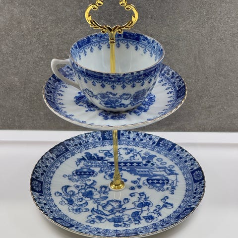 med blommigt mönster med 3 våningar och gulddetaljer.