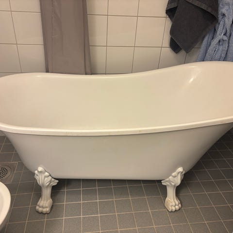 Fristående badkar i vitt utförande. Kompakt modell som passar mindre badrum. Badkaret har rundade kanter och inbyggd sitt-/fotdel. Avlopp och bräddavlopp är placerade i ena änden. Lämpligt för installation tillsammans med väggmonterad blandare och duschset. Passar för inomhusbruk i badrum. 80 cm högt, 120 cm brett. Endast upphämtning