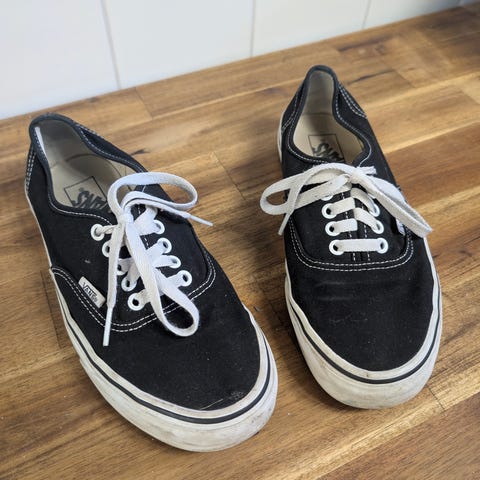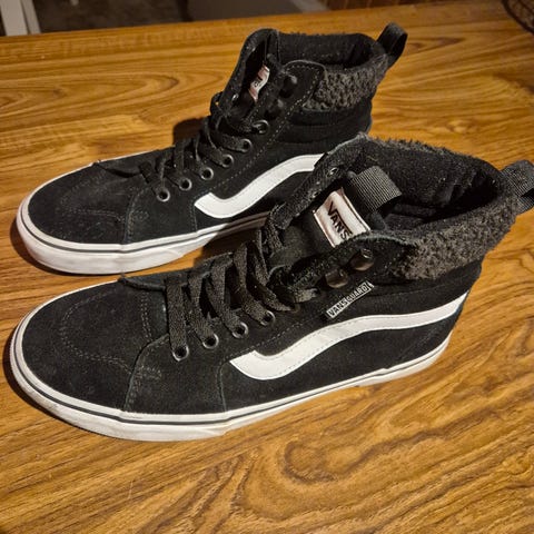 Vans sneakers i storlek 39. Skorna är svartvita med vit sula och vita skosnören. Ovandel i textil och syntet med kontrastsömmar. Klassisk Vans-etikett bak på hälen och på plösen. Yttersula i gummi med karakteristiskt våffelmönster. Passar till vardagsbruk och fritid.