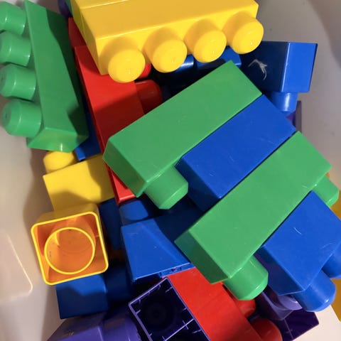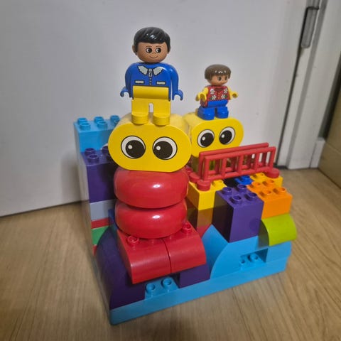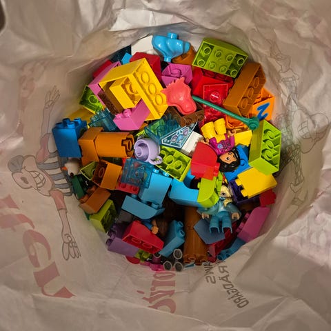 Lego Duplo klossar i blandade färger och former. Innehåller större byggklossar och olika specialdelar som till exempel fordon- och djurdelar. Passar för yngre barn som vill bygga enkla konstruktioner och leka med figurer och tillbehör. Exakt antal delar och specifika set är inte angivna.