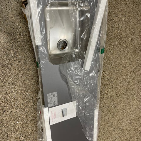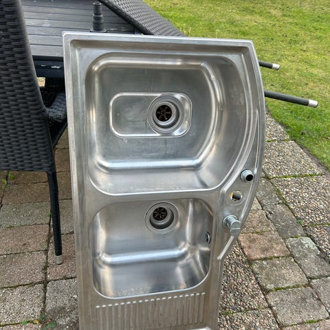 Diskho med dubbla hoar i rostfritt stål. Utrustad med två avlopp och bräddavlopp, samt hål för blandare. Avsedd för inbyggnad i bänkskiva i kök eller grovkök.