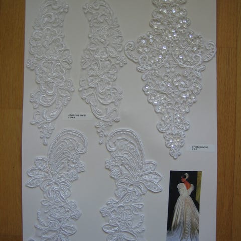 Diverse olika vackra pärlor, knappar, tygrosor, tygros-brosch/hårspänne och accessoarer till bröllop. Allt är uppklistrat eller fastsatt med tex gummitråd på ett 45 cm x 30 cm tjockt kartongpapper som ligger i en stor plastficka. Jag har tagit ur plastfickan tillfälligt för att kunna fotografera bättre.