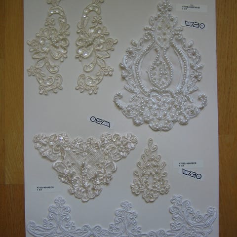 Bröllop pärlor, knappar, tygrosor, accessoarer Visningsexemplar