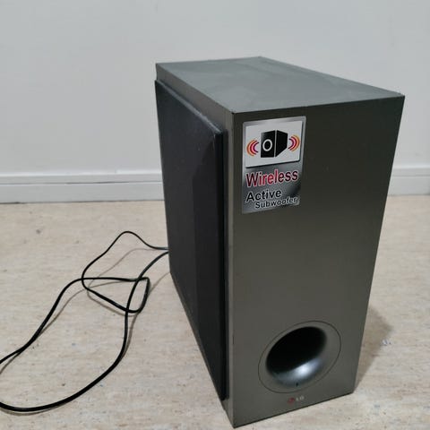 LG hemmabiosystem med subwoofer, två fronthögtalare och medföljande fjärrkontroll. Systemet är i svart utförande och är avsett för användning tillsammans med tv eller annan ljudkälla för uppspelning av film och musik i hemmamiljö. Passar för placering i vardagsrum eller liknande utrymmen där man önskar flerkanalsljud med separat baslåda.