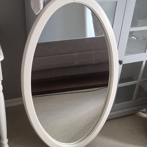 IKEA oval spegel i vit ram. Väggspegel som passar i till exempel sovrum, hall eller vardagsrum. Enkel, neutral design som är lätt att kombinera med olika inredningsstilar. 99X59 cm