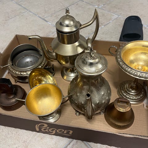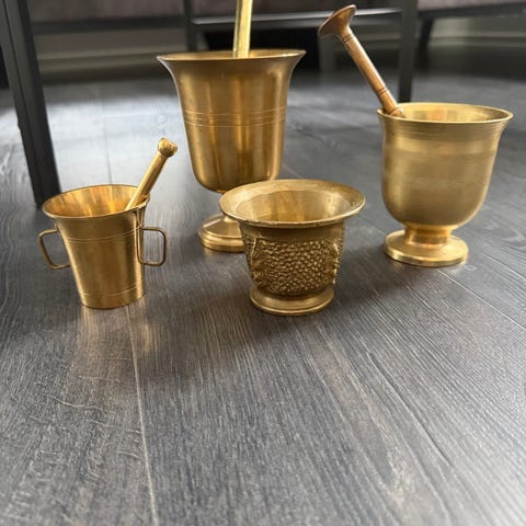 Set med flera mortlar i mässing med tillhörande stötar. Mortlarna är i olika storlekar och har handtag på sidorna. Mycket tyngd.