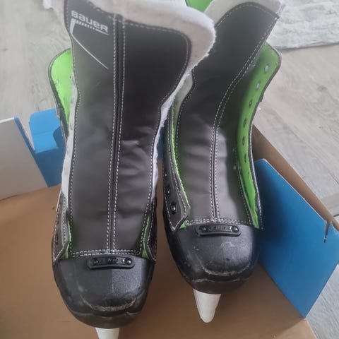 Bauer ishockeyskridskor för barn/ungdom i storlek 39. Modellen är svart med gröna detaljer och vit skena. Skridskorna är avsedda för ishockey och har snörning framtill med flera snörhål för att kunna justera passformen runt fot och ankel. Passar för barn eller ungdomar som behöver skridskor i storlek 39 för träning eller spel på is.