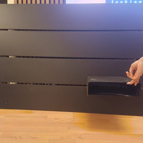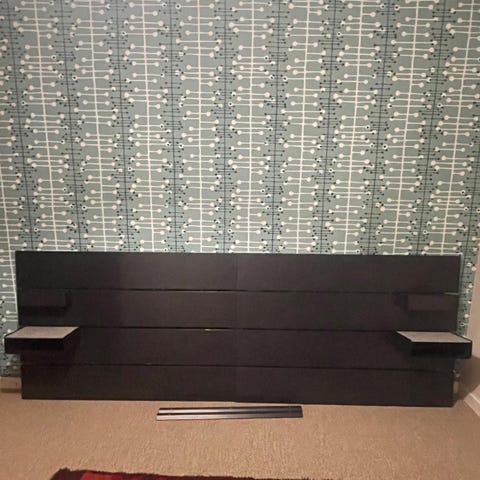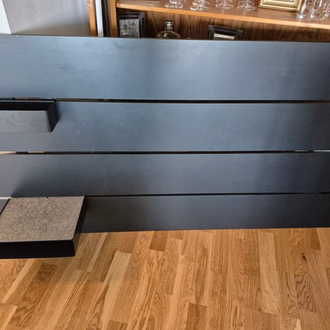 IKEA sänggavel i svart färg. Gaveln är väggmonterad och består av horisontella paneler. På gaveln finns ett mindre, löstagbart sängbord och en förvaringshylla som kan användas för till exempel mobil, glasögon eller mindre föremål. Även det löstagbart/flyttbart.