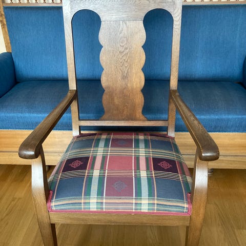Trästommen har en fin patina med naturligt bruksslitage som ger karaktär. Tyget är i mycket gott skick, rent och fräscht utan synliga skador. Stolen är stabil och mycket bekväm att sitta i.