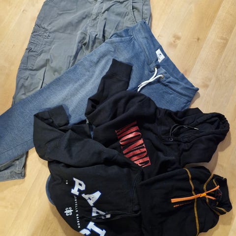 Herrkläder i storlek S-M, någon enstaka T-shirt är i barnstorlek 170. Plaggen är från flera märken och i flera färger. Blandningen består av framförallt tröjor och t‑shirts, men även ett par byxor.