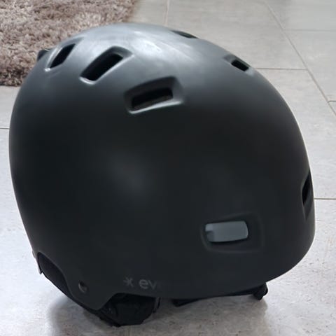 Giro Bevel hjälm till skidor/snowboard i storlek M, 55.5-59. Hjälmen är svart med flera ventilationsöppningar upptill och baktill. Invändigt finns stötdämpande frigolit och justerbara remmar under hakan för att kunna anpassas efter huvudets storlek.