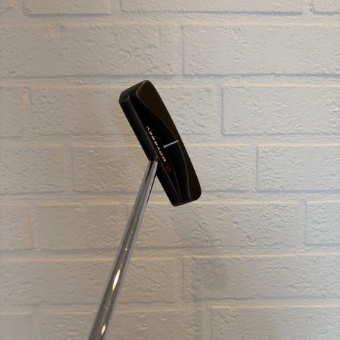 Odyssey golfputter med svart klubbhuvud och matchande svart headcover med mönster. Putter med metallskaft och grepp från SuperStroke. Passar för golfspelare som söker en mallet-putter med skyddande headcover för förvaring och transport på banan.