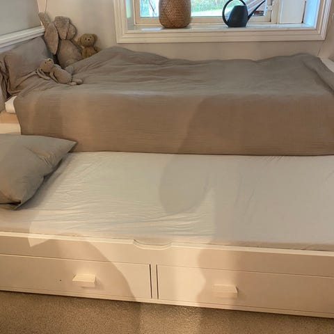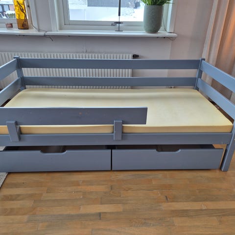 Skummadrass från IKEA i fint skick ingår. Om man vill kan man också få matchande madrasskydd och dra-på lakan som passar.