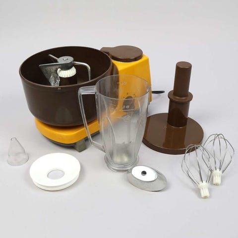 Bosch hushållsassistent 7200 med stor rostfri bunke. Ingår flera tillbehör, bland annat visp, degkrok, mixerbehållare, köttkvarn och olika insatser för matberedning.