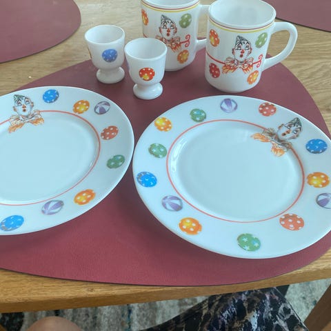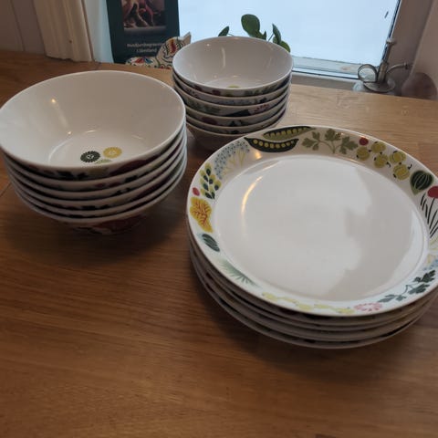 IKEA porslinservis med prickigt mönster i flera färger. Setet består av tallrikar och muggar i vitt porslin med färgade prickar. Passar för servering av vardagsmåltider och fika i kök eller matsal. Tallrikar och muggar är stapelbara för enkel förvaring.