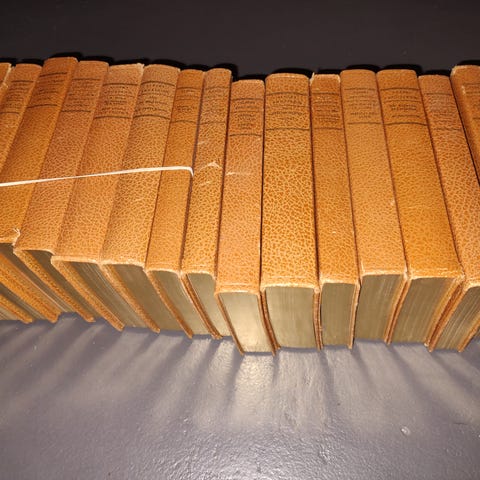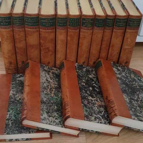 Albert Engström samlingsverk bokserie i flera band. Böckerna är inbundna med halvskinnband och marmorerade pärmar samt guldsnitt på översidan. Verken innehåller texter och teckningar av Albert Engström, bland annat titeln "Pampar och stackare" utgiven på Albert Bonniers förlag i Stockholm. Passar som komplett eller delvis komplett samling av författarens verk och som referenslitteratur eller samlarobjekt i bokhylla eller bibliotek.