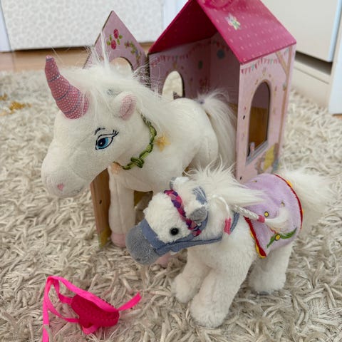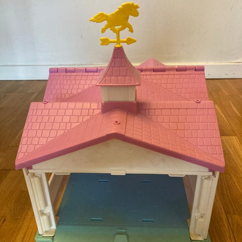 Träleksak stall med bärhandtag. Stallet är utformat som en hopfällbar byggnad med gångjärn och kan öppnas upp så att insidan blir tillgänglig för lek. Insidan har flera boxar med gallerliknande öppningar och skjutdörrar. Utsidan har fönster och dörrar samt ett tak med mönstrad yta. Överst finns ett handtag som gör stallet lätt att bära med sig. Passar för lek med små djurfigurer eller liknande leksaker.