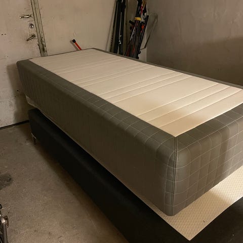Tempur madrasser i vit färg. Består av två separata bäddar med Tempur-madrasser ovanpå sängbottnar. Ytskiktet på madrasserna har rutmönstrad kviltning. Passar som dubbelsäng eller två enkelsängar beroende på behov och placering i sovrum.