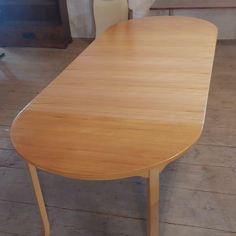 Matbord 120 x 80 x 70 och fyra bekväma stolar i ljust trä säljes i centrala Gävle.