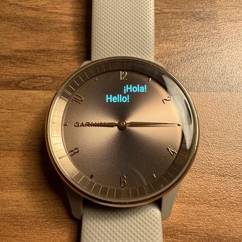 Garmin Vivomove sportklocka i svart färg. Klockan har analog urtavla med visare och diskret aktivitetsmätning. Armbandet är i svart material med justerbart spänne. På bilderna syns originalförpackning och laddkabel med USB-anslutning. Passar för vardagsanvändning och enklare aktivitetsregistrering.