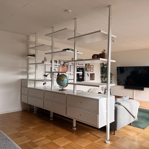 Säljer ELVARLI öppen förvaring. Är både snygg och praktiskt. Säljer få vi gör om och får tyvärr inte plats med den längre. Allt kommer med och enligt bilder. Ca 160 cm bred och 217 cm hög. Är nedmonterad och lätt att sätta upp. Tre av hyllplanen har skavanker varav ett lite djupare hack. Se bilder. Det är inget som påverka helheten eller funktionen. Ny pris ca 6000:- Säljer för 3000:-