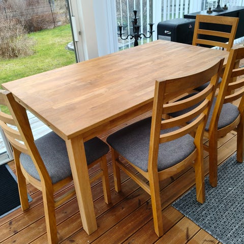 Ekbord i massiv ek o fyra tillhörande stolar. En extra skiva till bordet 40 cm. Stolarna i behov av omkläddes