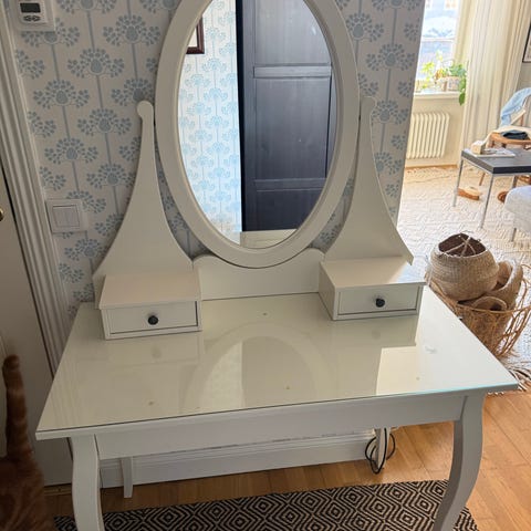 Säljer detta skrivbord/ sminkbord vid namn Bestå burs som är i mycket fint skick! Ovanpå ligger en glasskiva som gör att den ser extra lyxig ut (går att bara lyfta bort om man föredrar det).