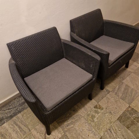 Utemöbelgrupp i svart konstrotting bestående av en tvåsits soffa, två fåtöljer och ett rektangulärt bord. Möbelgruppen är anpassad för utebruk, exempelvis på balkong, altan eller uteplats. Bordet har en öppen underdel för förvaring och en plan ovansida för servering eller avställning. Konstrotting är ett material som är avsett att tåla utomhusmiljö med varierande väderförhållanden.