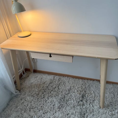 Säljer ett skrivbord, ”Lisabo” från IKEA. Bordsytan i askfaner och benen i massiv björk. En låda för förvaring.