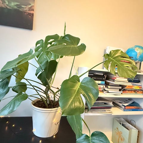 Monstera deliciosa krukväxt i plastkruka. Växten har stora, gröna, flikiga blad och passar som inomhusväxt i ljusa rum utan direkt stark sol. Lämplig som dekorativ grönväxt i vardagsrum, kök eller kontor. Kräver regelbunden men måttlig vattning och trivs i normal rumstemperatur.