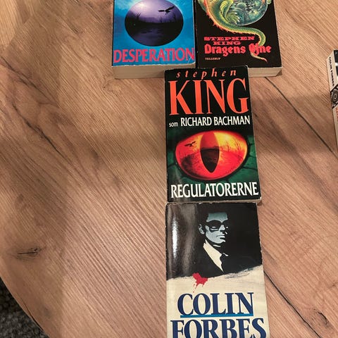Stephen King böcker, tre på svenska och en på engelska. Passar för läsare som är intresserade av skräck och spänning i romanform. Går bra att köpa alla som paket, eller i singular. Pris 100 kr per bok eller alla för 300 kr.