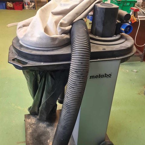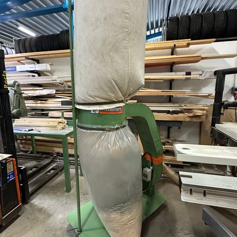 3-fas (550W) spånsug för fyllning av säck eller medföljande tunna. Manschett av gummiduk sluter tätt kring fatet.