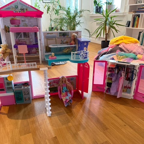 Säljer min dotters Barbiehus med tillbehör samt bil och garderob.