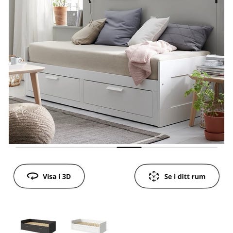 IKEA säng med förvaring i vit färg. Sängen har utdragslådor/förvaringsutrymme under liggytan, vilket ger extra plats för exempelvis sängkläder eller leksaker. Passar som enkelsäng i sovrum eller barnrum. Madrass ingår.