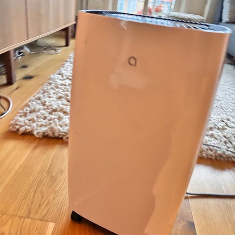 Woods luftavfuktare i vit färg. Fristående modell med elsladd för anslutning till vägguttag. Kontrollpanel med knappar och display på ovansidan. Avsedd för att sänka luftfuktigheten i inomhusmiljöer som källare, tvättstuga eller andra utrymmen där fuktnivån behöver regleras.9 månaders garanti återstår