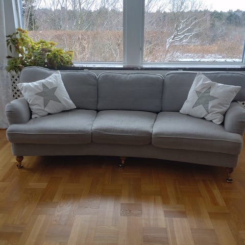 Jätte fin ljusgrå svängd soffa från Mio, modell Oxford.