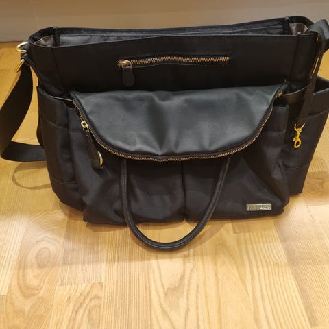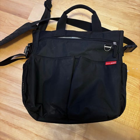 Skip Hop skötväska med skötunderlägg i svart. Väskan har flera ytter- och innerfack för förvaring av blöjor, kläder och tillbehör. Medföljande vikbart skötunderlägg i matchande material och färg, anpassat för blöjbyten när man är på språng. Bärhandtag upptill och axelrem för enkel transport.