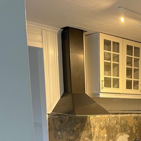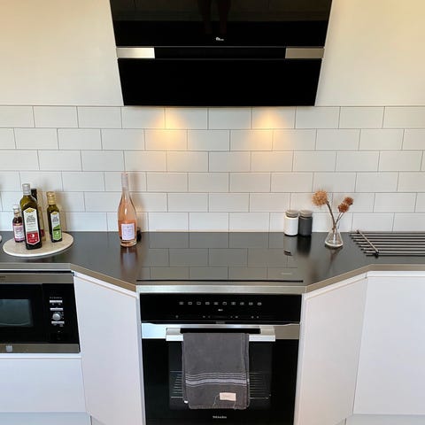 Väggmonterad köksfläkt i svart utförande. Modellen har en rak skorsten upp mot taket och en klassisk, sned front. Passar för montering ovanför spis eller häll i kök. Fläkten är avsedd för fast installation mot vägg och ansluts till ventilationskanal eller kolfilter beroende på system. Designen är anpassad för kök med överskåp och kaklad vägg.