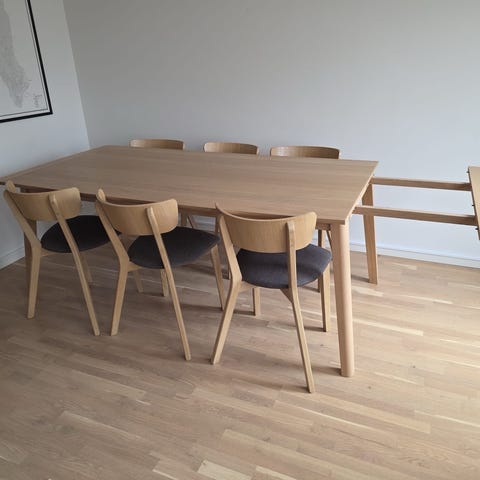 Matbordet tar rymligt 4 pers men kan absolut sitta 6 pers vid det.